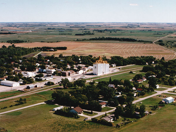 Aerial view of the former Manitoba Pool grain elevator at Cartwright (1997)
