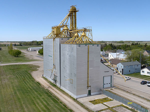 Aerial view of the former Manitoba Pool grain elevator at Cartwright (May 2021)