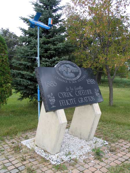 This monument in the Rural Municipality of DeSalaberry commemorates the family of Cyriac Catellier and Felicite Gratton. Nearby is a monument for Ecole La Rochelle No. 1133.