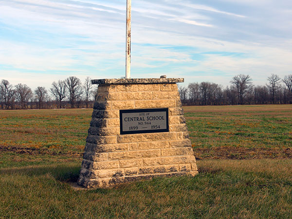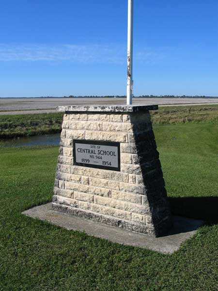 A monument marks the location of Central School, which was organized in March 1898. A school building was constructed the next year in the southwest quarter of 12-6-5 west of the Principal Meridian, in the Rural Municipality of Dufferin. It closed in 1954 when it was consolidated into Carman Consolidated School No. 176. As of the early 1990s, the former school building sat vacant at SW4-6-5W (about N49.44880, W98.09108).