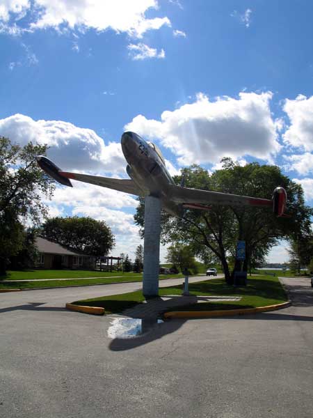 This aircraft monument in Gimli was presented by the officers and men of Canadian Forces Base Gimli to commemorate years of friendship and cooperation during operations of the base between 1943 and 1971. The plane, a T-33 Silver Star (later designated CT-133), was brought into town on 29 June 1971.