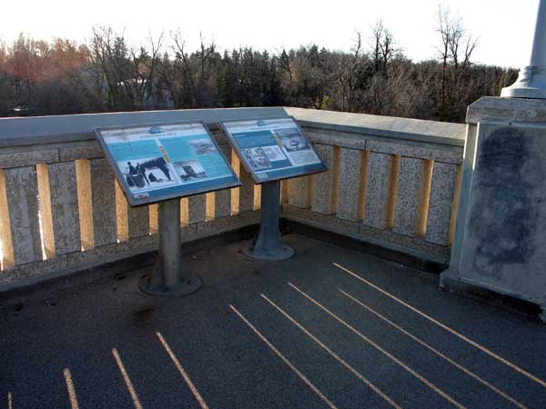 A series of plaques on and around the Charleswood Bridge were unveiled in October 1995 as part of the bridge construction project. They highlight the natural and social history of the local area.