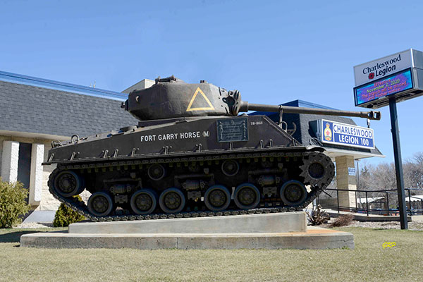 This military memorial in front of the Charleswood Legion No. 100 on Roblin Boulevard in Winnipeg features a Sherman tank.
