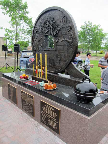 The monument in the Brandon Municipal Cemetery was commissioned by the Westman Chinese Association with financial support from the Government of Canada, Province of Manitoba, City of Brandon, Rotary Club of Brandon, Whitehead Foundation, and various private donors. Created by noted Manitoba sculptor Peter Sawatzky, the monument was unveiled during a ceremony on 26 June 2011.