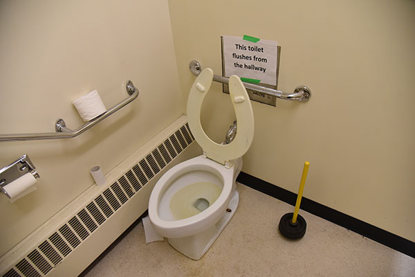 Hallway-flushing toilet from the former interrogation area (December 2023)