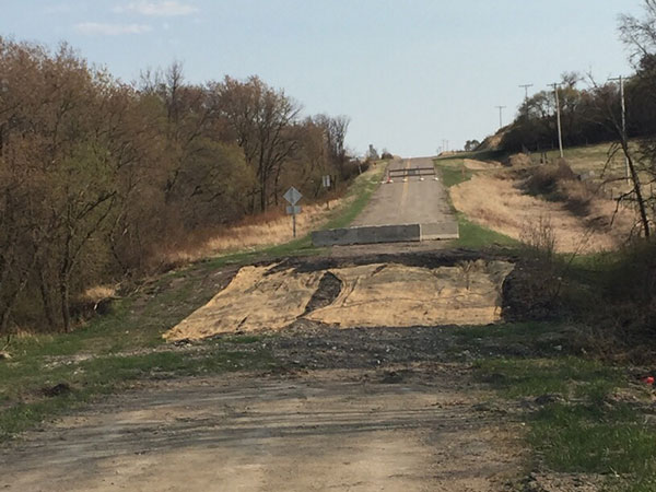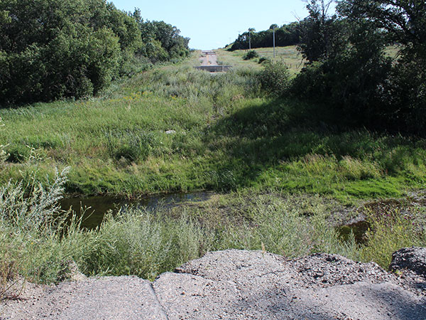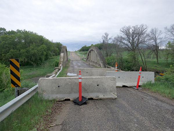 This concrete bowstring arch bridge over the Cypress Creek, near Clearwater in the Rural Municipality of Louise, was constructed between 1919 and 1920 by the Winnipeg construction firm of Alex Gall and Company. The cost of construction was about $13,700. In deteriorating condition, the bridge was closed to vehicular traffic in 2016 and demolished in the spring of 2018.