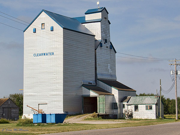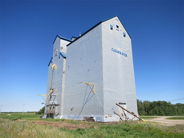 In July 1930, lightning struck the two-year-old Manitoba Pool elevator at Clearwater, on the CPR Napinka Subdivision in the Municipality of Louise, destroying it along with 25,000 bushels of grain. A replacement with the same 40,000-bushel capacity was built in just over a month. Expanded with a temporary annex in 1951, a permanent addition came in 1969 with the construction of a crib annex on its east side, increasing the total capacity to 124,500 bushels. Closed by Agricore in October 2000, it was sold into private ownership and remains in use for local grain storage.