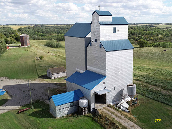 Aerial view of the former Manitoba Pool grain elevator at Clearwater (September 2020)