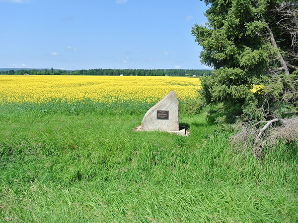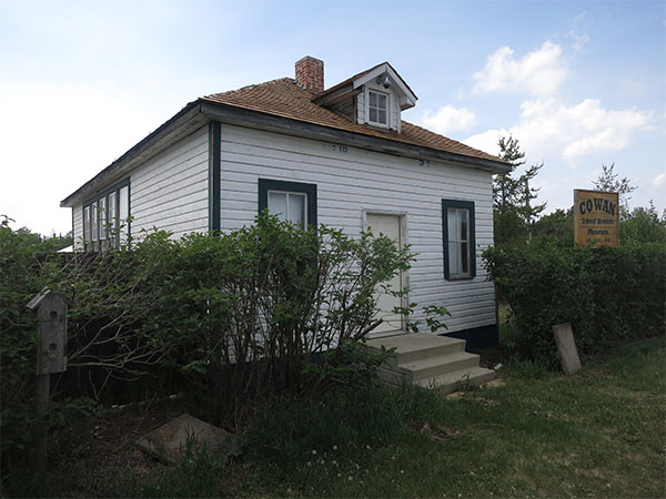 The Cowan School District was organized formally in July 1901 and a one-room schoolhouse (referred to locally as Cowan West School) operated at NE21-35-23-W in the Rural Municipality of Mountain. Destroyed by fire in 1949, classes were held in the teacherage until a new building could be constructed. The school closed in 1967 and the district was dissolved, its catchment area becoming part of the Intermountain School Division. The former schoolhouse was used as a granary for a time until, in 2003, it was moved into Cowan and restored for use as a private museum. A monument, dedicated on 5 August 2000, commemorates it at the original site. At the time of a 2015 site visit, the original log-walled teacherage was also present, concealed within a copse of trees.