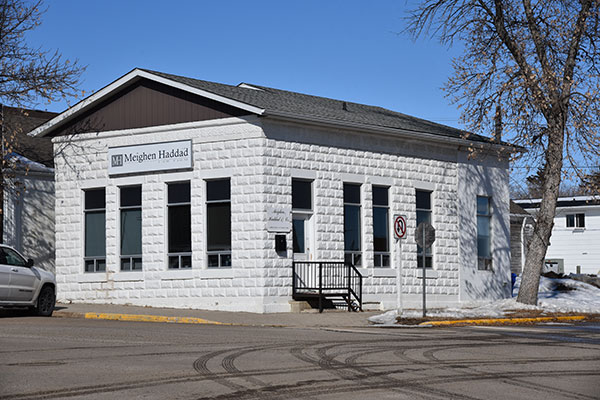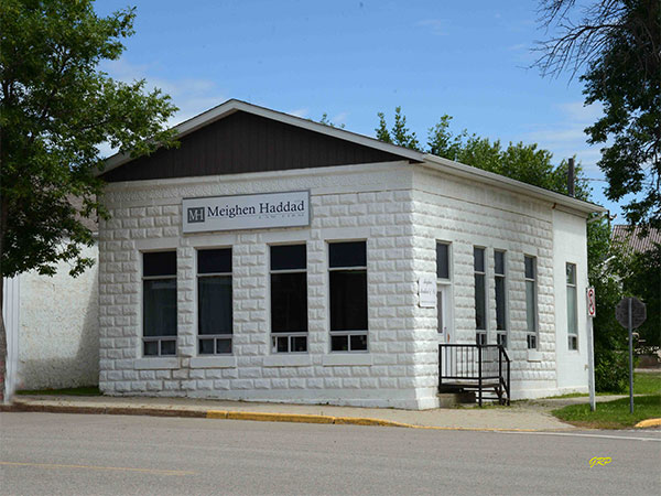 This concrete block building in Melita was built for lawyer John Crerar and he occupied it in July 1904. He took Frank G. Barrett into partnership in July 1926 and, after Crerar retired in January 1928, Barrett practiced alone until closing in May 1934, although Crerar retained ownership of the building. His estate sold it to lawyer David W. Yuill in 1938, who took his daughter Winnifred Yuill into partnership in July 1940. They practiced as Yuill & Yuill until Mr. Yuill died in 1970. Ms. Yuill sold the building to lawyer Morris H. Smeltz in July 1974 who renovated the entire building, except for the vault, and moved into it in November 1974. Four years later, wood frame additions were made on two sides of the original structure.