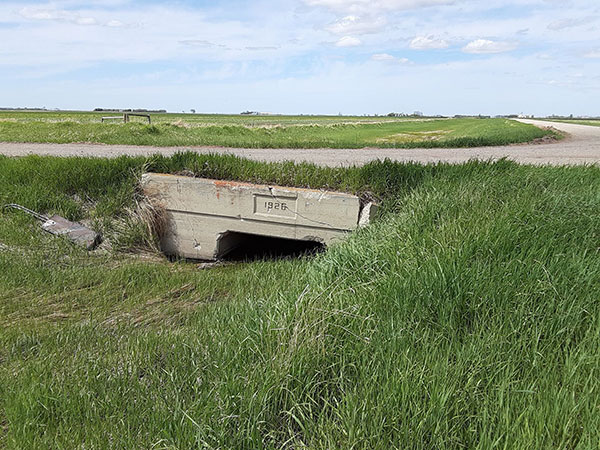 A concrete culvert bridge south of Deloraine in the Municipality of Deloraine-Winchester was constructed by the Winnipeg-based firm of Lacour & Schioler according to Plan 1255 and completed in July 1926 at a cost of $579.