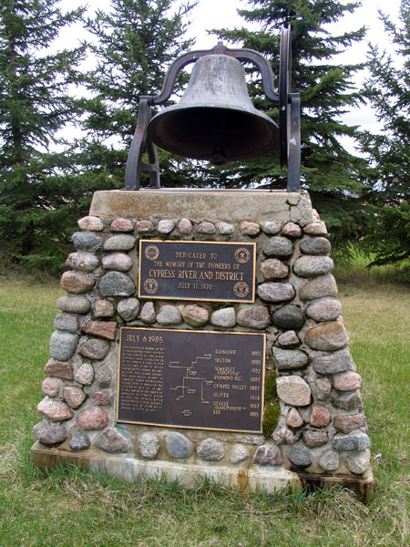 A monument at Cypress River was dedicated on 11 July 1970 to the memory of the pioneers of Cypress River and district. On top of the cairn is the bell from the former Cypress River Consolidated School No. 2357, and a plaque on the monument lists the rural schools around Cypress River, including Glencove School No. 205, Selton School No. 291, Richmond Hill School No. 363, Bru School No. 368, Cypress Valley School No. 394, Grange School No. 892, and Oliver School No. 1766.