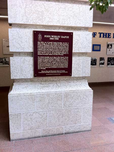 A plaque commemorating J. W. Dafoe, situated in the foyer of the offices of the Winnipeg Free Press, was unveiled by the Historic Sites and Monuments Board of Canada at the Free Press building on Carlton on 18 June 1976, in a ceremony attended by son Edwin Elcome “Ted” Dafoe. It was transferred to this location when the Free Press moved here in 1991.