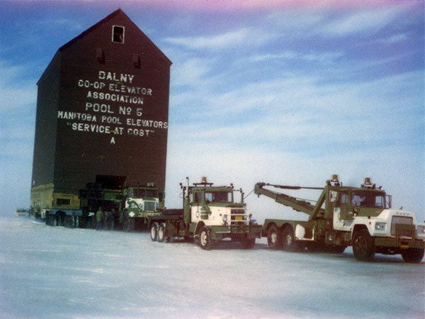 A wooden grain elevator at the railway siding of Dalny, on the CPR Lyleton Subdivision in the Municipality of Two Borders, was formerly operated for Manitoba Pool Elevators by one of the original seven Cooperative Elevator Associations established in 1925. Founding officers of the association were E. C. Ramsay (President), William Henry Carlton (Vice-President), Edwin John Kontzie (Secretary), Charles William Kontzie (Director), F. E. Thompson (Director), Gus W. Neumann (Director), and William Whittle Palmer (Director). Between 1951 and 1952, the original elevator was converted to an annex on the west side of a newly built elevator. An additional crib annex was built on the east side in 1956, increasing the facility's total capacity to 100,000 bushels. In 1982, the newer annex was moved to Goodlands. The facility was closed in July 1983 as the railway line was abandoned and the rails were removed. The elevator and its old annex were sold to a local farmer who uses them for private grain storage.