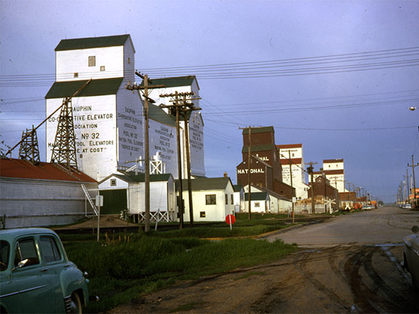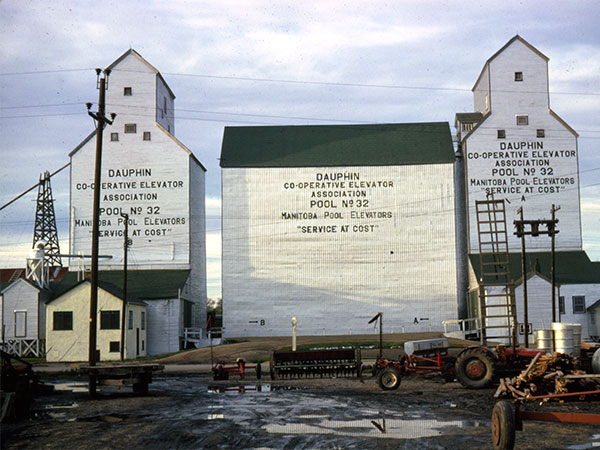 A 50,000-bushel wooden grain elevator at Dauphin on the CNR Gladstone Subdivision was built for a local association of farmers by Manitoba Pool Elevators in 1927. It became known as “Pool B” when a new 40,000-bushel elevator designated “Pool A” was built beside it in 1948. Needing additional storage capacity by 1951, a balloon annex was built beside B while a new crib annex was attached to A, increasing their cumulative capacities to 95,000 and 115,000 bushels, respectively. The Pool B elevator was closed by 1983 and later demolished. The Pool A elevator closed in 1985 when a newly-built elevator on the edge of town opened.