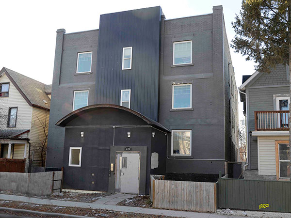 This three-storey brick apartment block on Furby Street in Winnipeg was designed by local architect Pall Melsted “Paul” Clemens and constructed in 1910 by contractor Jon Tryggvi Bergman at a cost of $35,000. The 74 by 42 foot building contained 14 apartments.