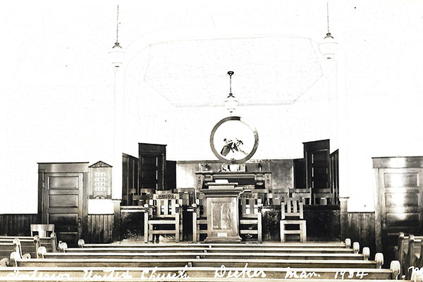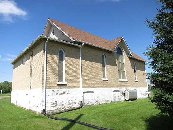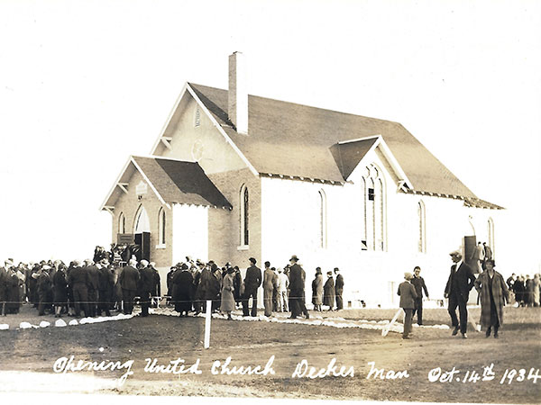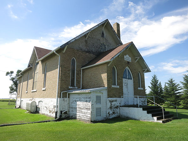 This one-storey brick structure at Decker, in the Municipality of Hamiota, was built in 1934 using materials salvaged from Knox Presbyterian Church at Hamiota that had closed in June 1930 when its congregation united with that of Zion Methodist Church. An opening service was held on 14 October 1934.