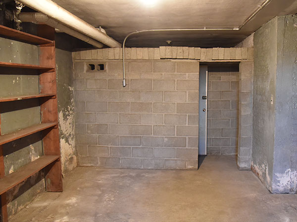 Cinder block walls of Fallout Reporting Post EE32 in the basement of the Dominion Post Office Building at Deloraine (September 2021)