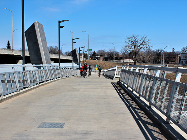 A year later, the project was completed at a cost of $5.5 million and an official ribbon-cutting and rocket launching (one rocket for each levels of government) opening ceremony was held on 19 October 1960. Accompanied by the Winnipeg Police Pipe Band, the bridge was opened officially by Mayor Stephen Juba. Also in attendance was Premier Duff Roblin and members of the East Kildonan Municipal Council. A reception later that day was held at the Fort Garry Hotel where one of the commemorative luncheon menu items was “Cream of Chicken Disraeli,” served to an invitation-only crowd. A commemorative plaque unveiled that day was later replaced with the present plaque, then affixed to the original bridge structure, and a larger roadside monument situated near the corner of Disraeli, Maple Street, and Henry Avenue.