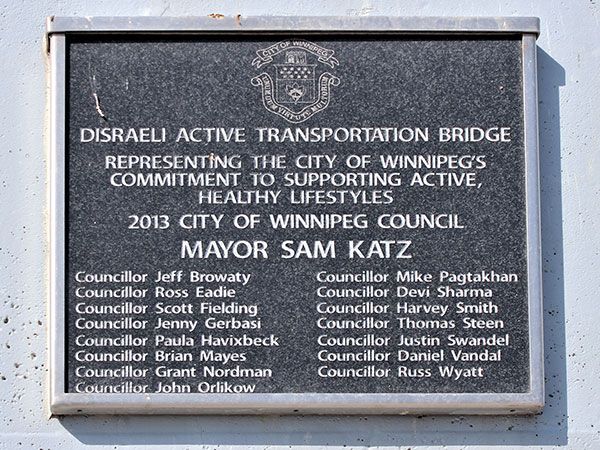 Disraeli Active Transportation Bridge plaque (March 2020)
