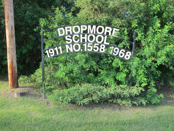 The Dropmore School District was organized formally in February 1911 and a school operated on the northwest quarter of 26-23-29 west of the Principal Meridian in what is now the Rural Municipality of Riding Mountain West. In 1952, the original building was replaced by the present structure. It closed in June 1968, after which students were bused to Roblin. A commemorative sign stands near the former school building.