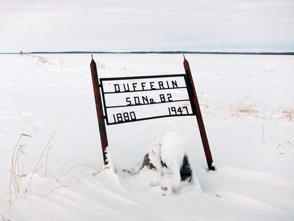 The Dufferin School District was organized formally in January 1880 and, until 1909, a wood frame school building operated one mile north and a quarter mile north of this site in the Rural Municipality of Montcalm, on River Lot 53. The building was moved here, to the southeast corner of SW23-1-2E, in 1909 where it continued operation until closing in 1947. The remaining students went to Emerson Consolidated School No. 2365, and the district was dissolved in 1959. The building is no longer present at the site but a metal sign commemorates it.