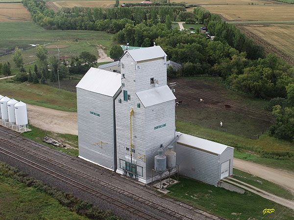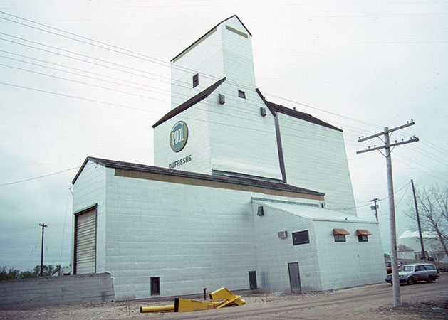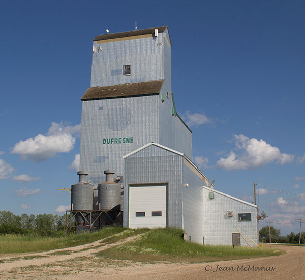 A wooden grain elevator at Dufresne, on the CNR Sprague Subdivision in the Rural Municipality of Tache, was built in 1948 by the Manitoba Pool Elevators. Closed by Agricore in November 2000, the elevator was purchased by a group of four local farmers and has been used for private grain storage since 2001.