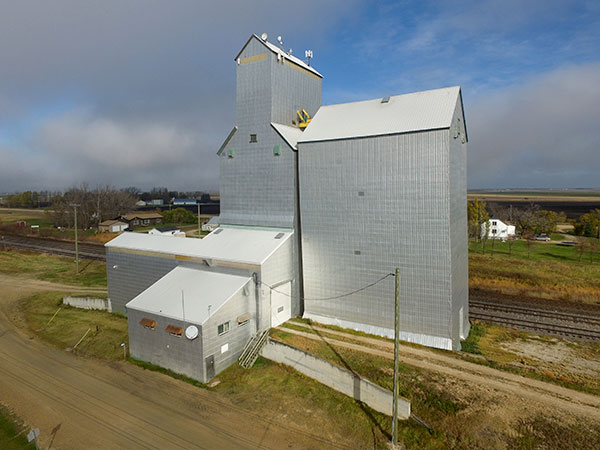 Aerial view of the former Manitoba Pool grain elevator at Dufresne (September 2020)