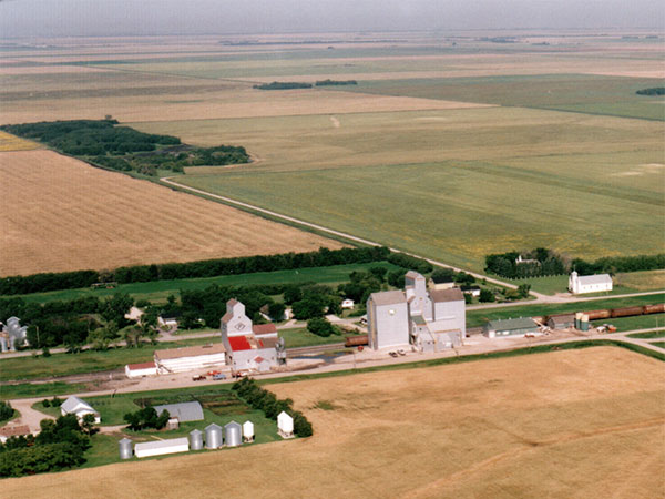Aerial view of grain elevators at Dufrost (1993)