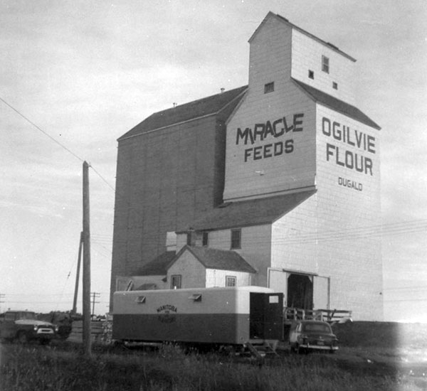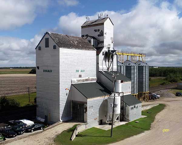 A wooden grain elevator at Dugald, on the CNR Minaki Subdivision in the Rural Municipality of Springfield, was built in 1948 by Ogilvie Flour Mills to replace the original elevator destroyed by a fire spread from the burning wreckage of the Dugald Train Disaster during the night of 1 September 1947 when a westbound passenger train collided with an eastbound train discharging passengers at the Dugald station.