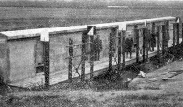 The larger of the concrete structures, to the north, measuring 130 feet long, 30 feet high, 11 feet wide at the base, and 4 feet 9 inches at the top, was a stop butt intended to stop bullets fired at it by target shooters. The smaller of the two structures, exactly 100 feet to the south of the stop butt, also measured 130 feet long. It was a shelter used to protect personnel engaged in target marking.
