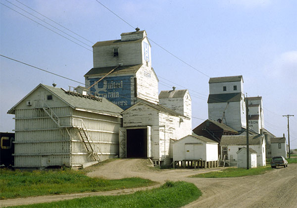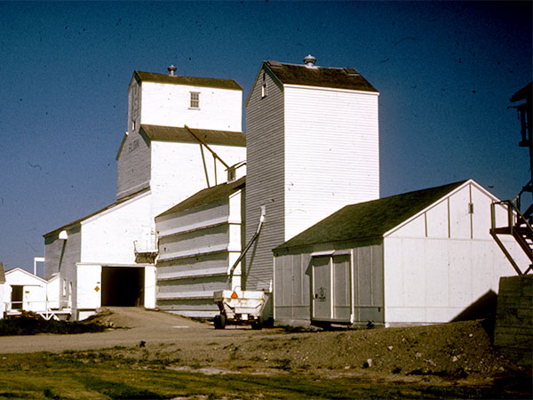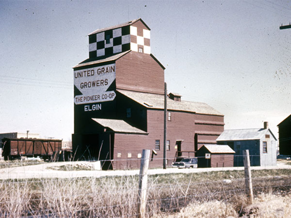 This wooden grain elevator in Elgin, on the CNR Hartney Subdivision in the Municipality of Grassland, was built in 1928 by the Canadian Consolidated Grain Company. Sold to United Grain Growers in 1959, it was thoroughly renovated in 1965 and, the following year, a balloon annex from the nearby Paterson elevator was moved beside it. Closed in 1985, the elevator was later removed from the site.