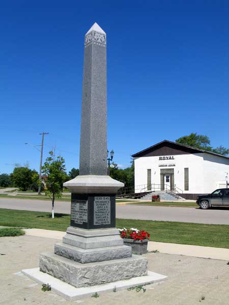 This monument at Elkhorn in the Rural Municipality of Wallace-Woodworth was erected in commemoration of soldiers from the local area killed during military service. Made by the Portage la Prairie firm of Guinn and Simpson at a cost of $1,500, the monument was unveiled on 11 September 1927 at a ceremony attended by General H. D. B. Ketchen.