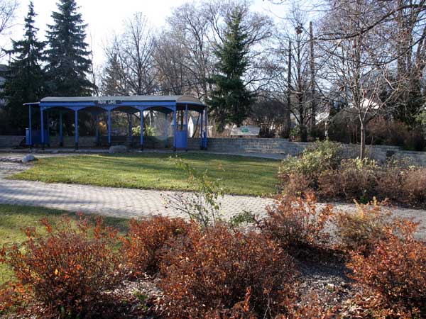 An enclosure in the park mimics an old streetcar. Beside it is a set of three interpretive plaques describing the development of River Park, a large recreational facility, and the neighbourhood in which it was located.
