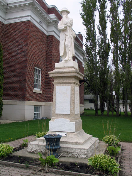 The Soldiers Memorial located at the Emerson Town Hall was constructed in 1919-1920 in memory of the men and women who served in the First World War. It features a stone sculpture of a soldier craft by St. Boniface sculptor Nicolas Pirotton. The monument was subsequently expanded to include those who served in the Second World War.