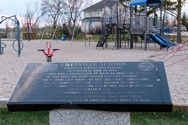 The Emesville School District was established in November 1913, named for local farmer and municipal councilor Daniel Henry “Dan” Emes. A one-room schoolhouse operated at NE17-12-3E in the Rural Municipality of West St. Paul. In Septemer 1946, a $3,500 loan was secured to build a new schoolhouse. The school closed in 1961 and the district was dissolved in the following year. The building was moved to Blackdale Road and renovated into a private residence. A playground called Emesville Park and a commemorative plaque occupy the former school site.