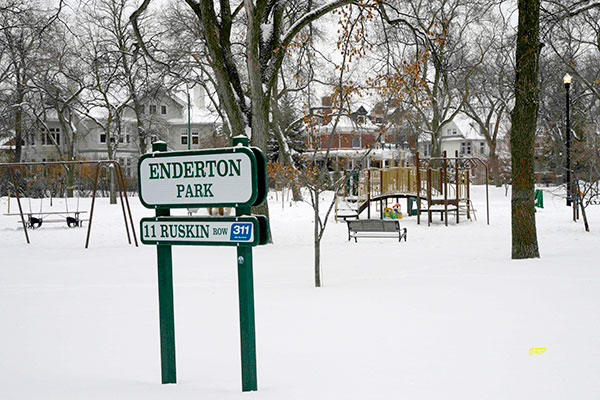 Bordered by Ruskin Street, Yale Avenue, Amherst Street (now Avonhurst Street), and Harvard Avenue, this Winnipeg site commemorates realtor Charles Henry Enderton who established an English country garden on the grounds. He offered the property to the Winnipeg Parks Board in September 1902 and his offer was accepted in 1903. Originally named Crescentwood Park for the surrounding neighbourhood, the two-acre park was posthumously renamed for Enderton in July 1924.