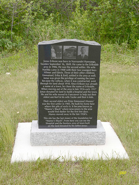 In 1906, Swedish immigrant Jonas Erikson (1849-?) was the second settler to arrive at the new village of Eriksdale, in what is now the Municipality of West Interlake. He was given the privilege of naming the town because the railway passed through his land. When he moved away in 1917, he donated his land to build a hospital and the town.