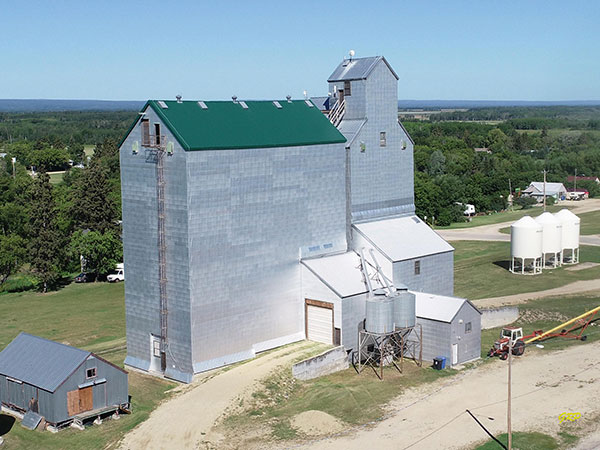 Aerial view of the former Manitoba Pool grain elevator at Ethelbert (August 2020)