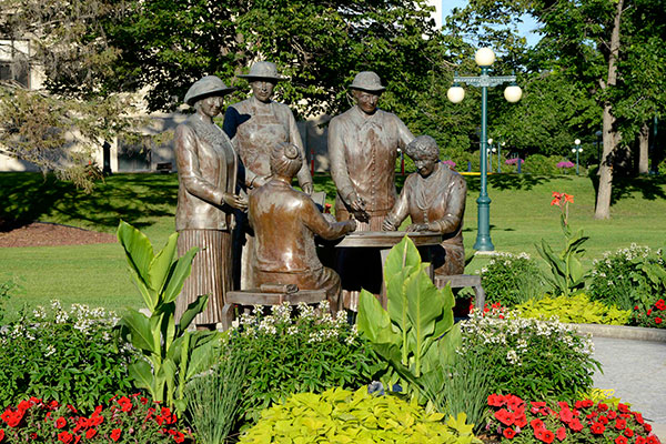 This bronze sculpture of the “Famous Five”—the five women whose challenge to the Supreme Court of Canada in 1929 resulted in women being legally recognized as persons under the British North America Act—was unveiled at a ceremony on 18 June 2010. Created by local sculptor Helen Lillian Granger Young at an estimated cost of $750,000 on behalf of the Nellie McClung Foundation, the monument is one of three on the grounds of the Manitoba Legislative Building focusing on women, the others being monuments of Queen Victoria (on the north grounds) and Queen Elizabeth II (on the east grounds near Government House).