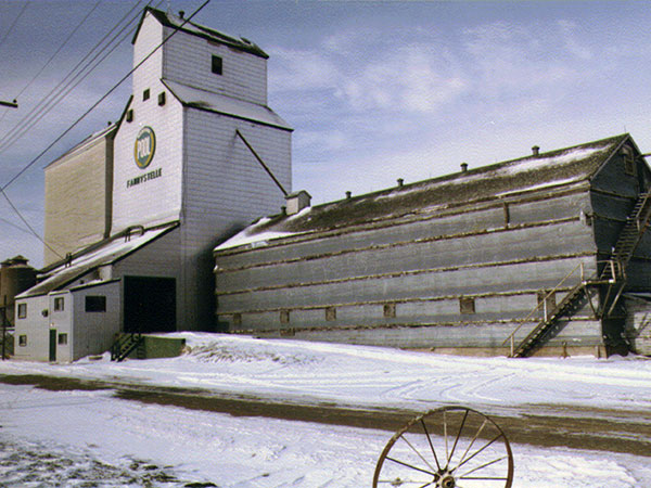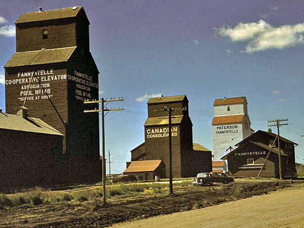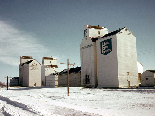 A 50,000-bushel wooden grain elevator at Fannystelle in the Rural Municipality of Grey was built in 1929 by Manitoba Pool Elevators for a local cooperative association. Over the years, it was expanded with two annexes: a 54,000-bushel balloon annex on its east side in 1950 and a 57,000-bushel crib annex on its west side in 1958. The entire complex was traded to United Grain Growers in 1990 and closed later that year, when a new concrete elevator opened nearby. It has since been demolished.