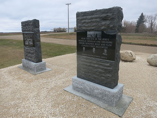 A stone monument at Homewood, in the Rural Municipality of Dufferin, was erected in 2018 by the Canadian Aviation Historical Society to commemorate the site where, in the 1930s, brothers Nicholas “Nic” Froebe (1910-1959), Douglas Fitch “Doug” Froebe (1912-1994), and Theodore Fitch “Deed” Froebe (1913-1943) designed, built, and flew Canada’s first helicopter.
