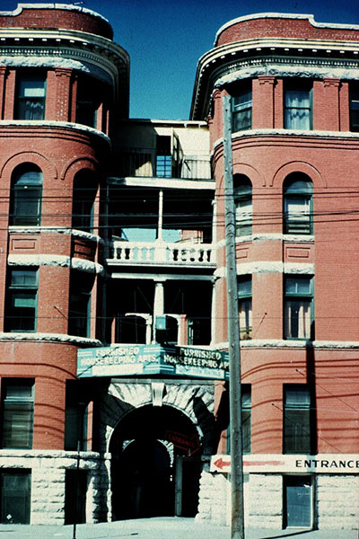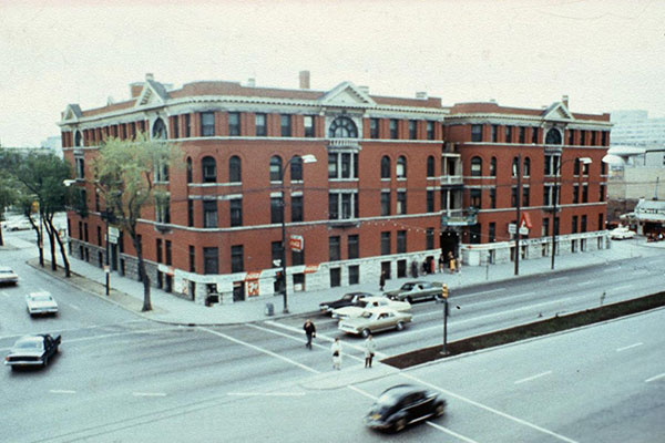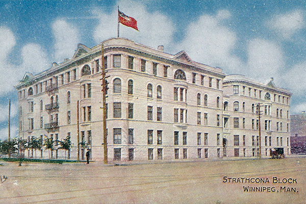 Formerly located at the northwest corner of Main Street and Broadway in Winnipeg, this four-storey brick and stone block, measuring 179 feet by 124 feet, was designed by architect George Creeford Browne and built in 1902 by Philip Burnett and George Andrews Mitchell under the supervision of Edward George Sherwood, for owner Donald Alexander Smith, at a cost of about $150,000. In its original configuration, it contained 106 residential apartments. Known initially as the Strathcona Block, by 1906 it was renamed the Fort Garry Court.