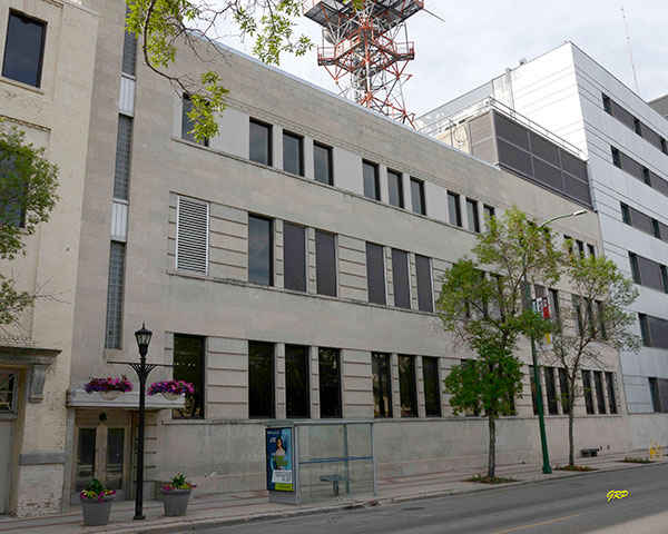 The first phase was designed by architect Samuel Hooper and built between 1907 and 1908, at a cost of about $35,000, for the Bell Telephone Company. The firm’s infrastructure in Manitoba was purchased the following year by Manitoba Government Telephones (later Manitoba Telephone System) and the building opened in 1909. Alterations to the building in 1922 were designed by John Hamilton Gordon Russell. Originally a two-storey building, a third storey was added in 1929 due to increased demand, at a cost of about $15,000.