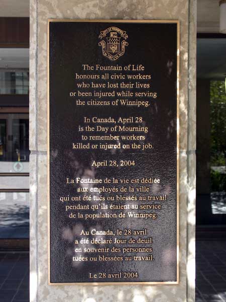 Located in the courtyard between the Council Building and the Administration Building of City Hall, 510 Main Street, the fountain and plaque commemorates all those City of Winnipeg employees who were injured or lost their lives while on the job. It was unveiled on 28 April 2004.