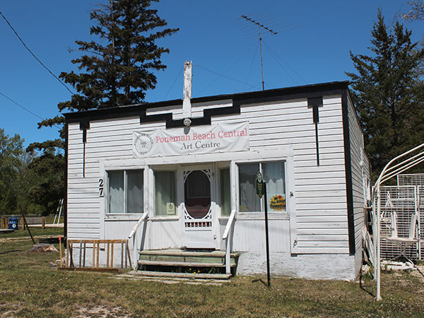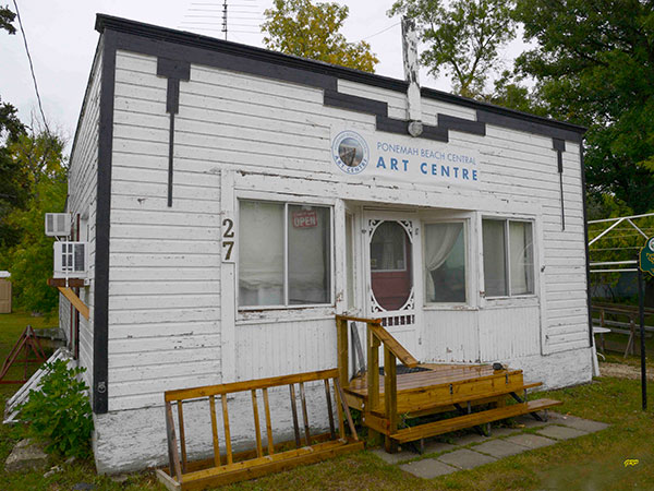This shed-roofed frame building with a low false front, at Ponemah in the Village of Dunnottar, was built around 1930 to replace an earlier building destroyed by fire. It served the area as a general store with living quarters at the rear. It also housed a post office and, for a time, the community’s only public telephone. Clad in wooden cove siding with corner boards and applied geometrical decoration on the front, the exterior has its original siding and details. It is now used by the Ponemah Beach Art Centre.