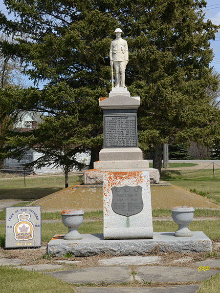 This monument in Foxwarren, in the Municipality of Prairie View, was erected in 1921 to commemorate soldiers from the local area killed during military service. Purchased from the Neepawa firm of Guinn & Simpson at a cost of $2,950, the monument was topped by a granite figure of a soldier carved in Italy. The committee responsible for the monument was led by Foxwarren Mayor Louis Armit and an unveiling ceremony was held on 11 November 1921.