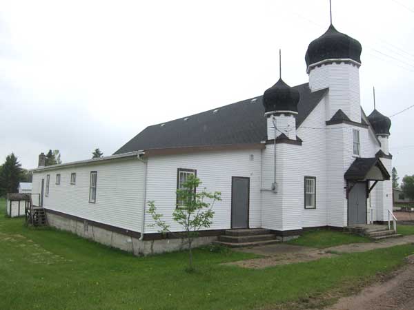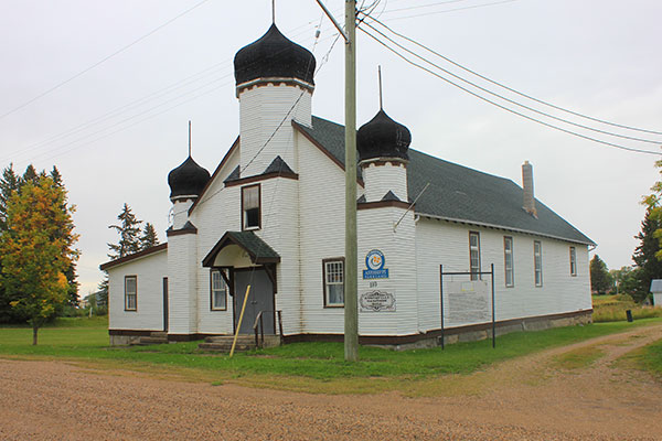 This social hall at Angusville in the Rural Municipality of Riding Mountain West, a municipally-designated historic site as of 1992, was built in 1934 by members of the Ukrainian National Home Society. It is rare in featuring three “banyas” or onion domes as part of its design. It also has a hand-painted curtain, unique stage and viewing balcony, bronze sculpture of Taras Shevchenko, the original hall charter, and a painting of King George V and Queen Mary. Restoration of the building was done as part of the Manitoba Prairie Icons Project.