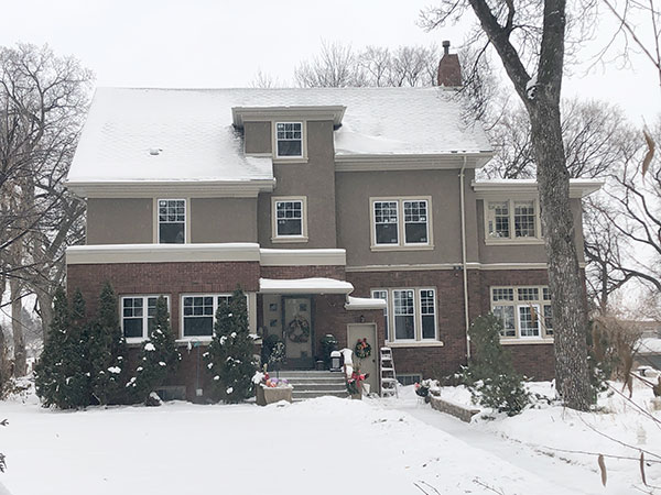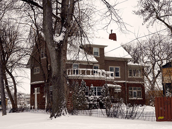 This 2½-storey red-brown brick and stucco house at the southeast corner of Scotia Street and Luxton Avenue in Winnipeg, measuring 33.8 feet by 52.9 feet, was designed and built in 1921 by local contractor Arthur John Bonnett for funeral director Arthur Bertram Gardiner at a cost of about $20,000. A one-storey brick and stucco two-car garage, measuring 21 feet by 28 feet, was also designed by built by Bonnett later in 1921 at a cost of about $2,500.