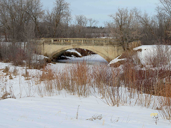 This concrete barrel-arch bridge on an abandoned portion of Provincial Trunk Highway #10, across the South Garland Creek in the Municipality of Ethelbert, south of Garland, was built in 1919 by the construction firm of Fowler and Young at a cost of $6,042. The year of construction is moulded into the upright concrete posts of its badly deteriorated railings.